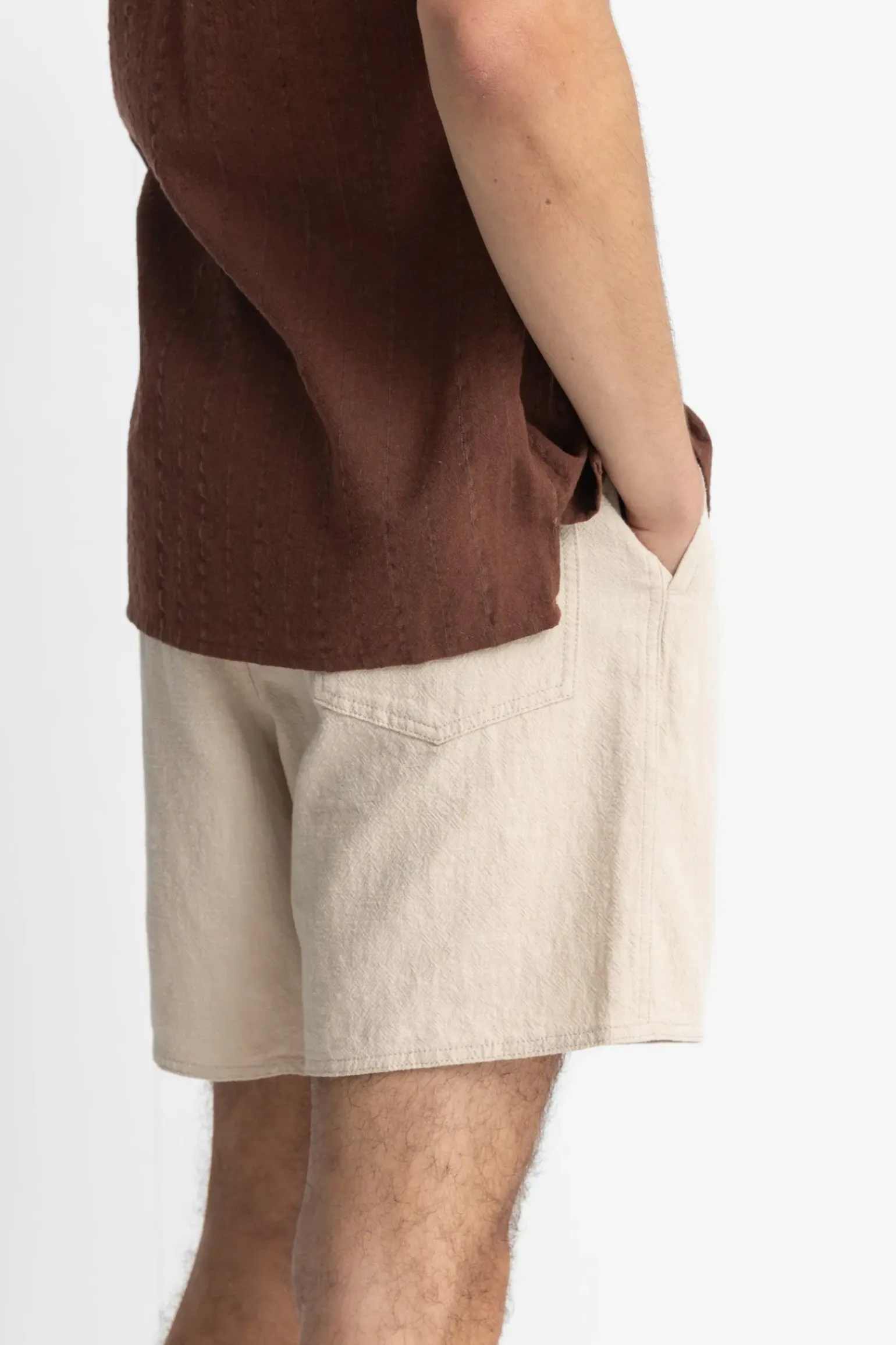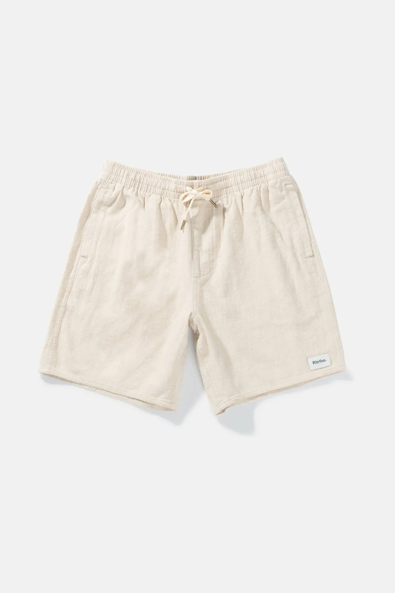 Your uncomplicated seasonal short for comfort and style crafted in a textured linen cotton blend. The textured linen jam features a relaxed elastic waist designed for everyday wear. —- Material 80% Ramie / 20% Cotton —- Features 17 inch Jam Textured linen Elastic waist Side pockets & back patch pocket Poly draw
