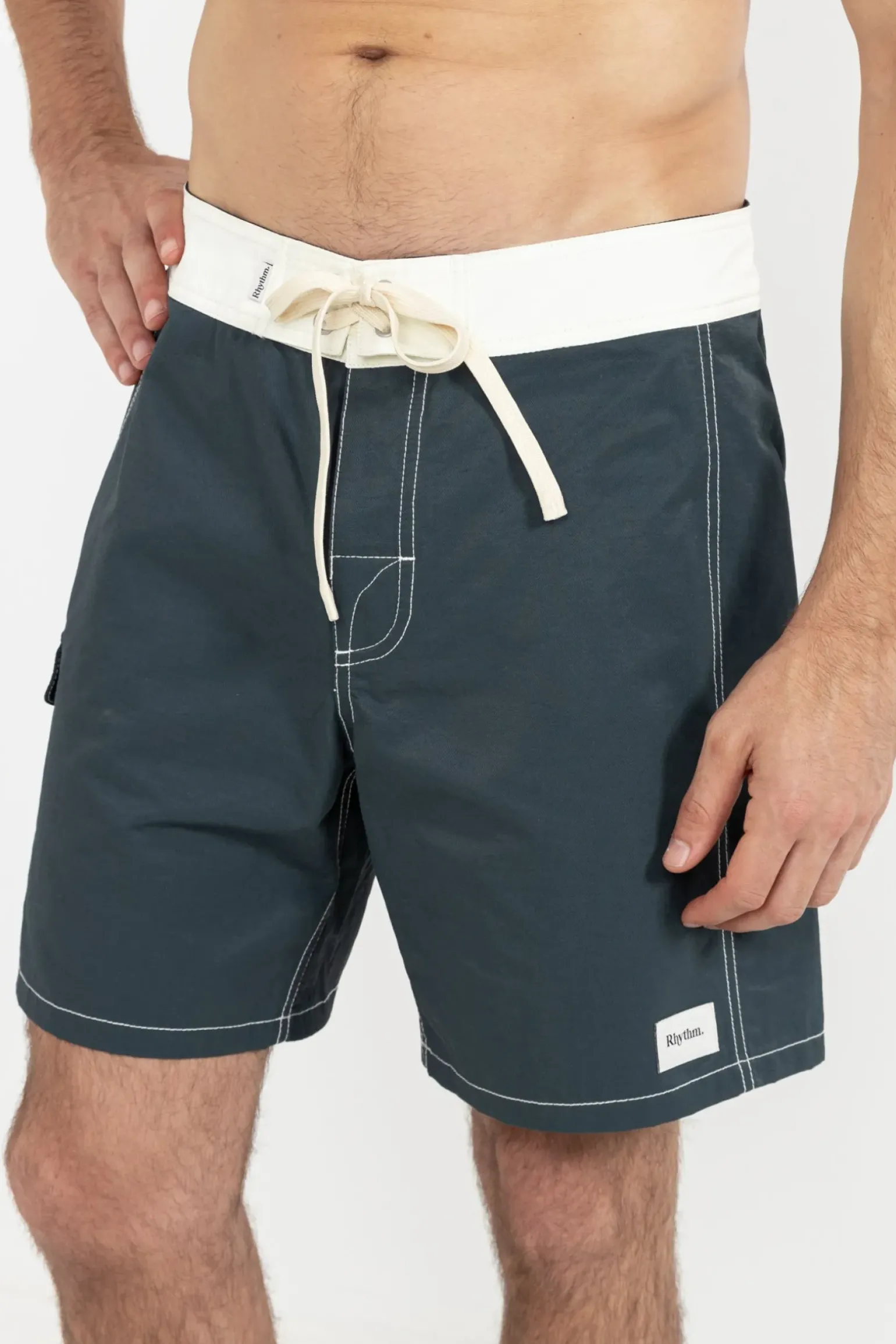 The Breakers Block Trunk in Stone Blue features a striking white contrast waistband and embroidered artwork on the right-hand pocket. Made for comfort and versatility, it's a summer staple. —- Material 65% COTTON 35% NYLON —- Features White contrast waistband Side pocket with embroidered artwork —- Size & Fit