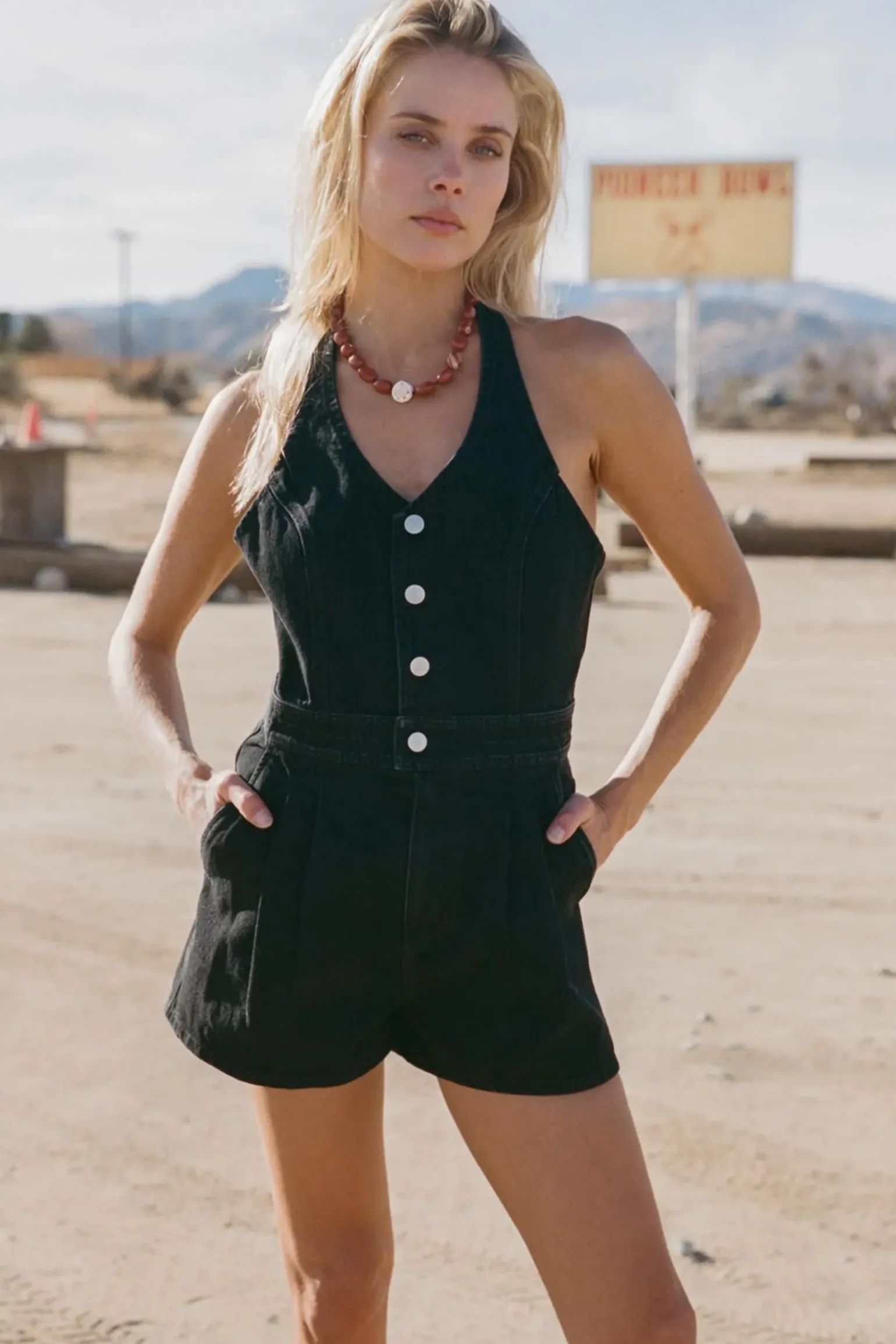 The Cassy Halter Denim Romper in Vintage Black redefines casual cool. Its easy-to-wear halter design is perfect for layering or wearing alone for a laid-back, on-trend look.