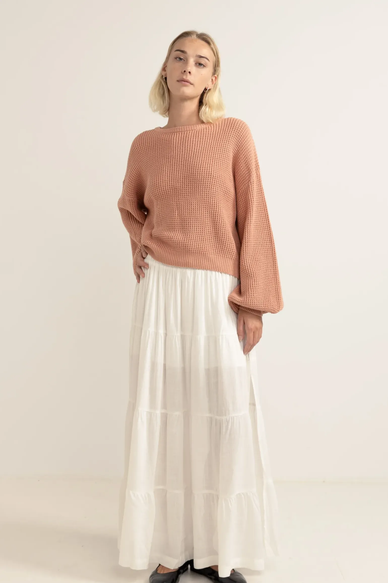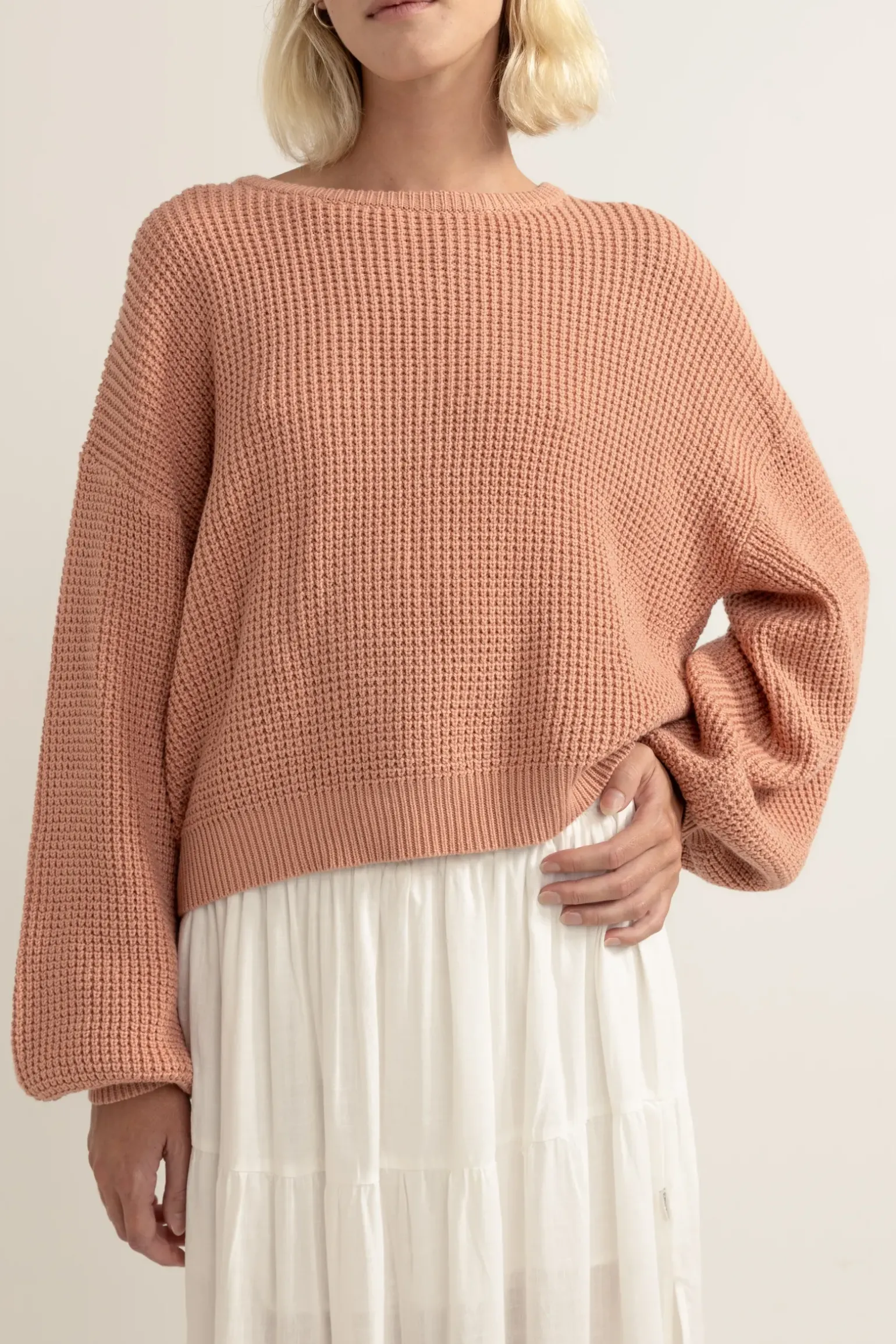 Soften into the Classic Knit Jumper in White, woven from a soft handed yarn blend to keep you cosy on the coolest of days. Complete the head-to-toe coordinated look with the matching Classic Knit Short or mix and match across the range.—-Material55% Acrylic 45% Cotton—- Features Relaxed fit Ballon sleeves Rib at ne