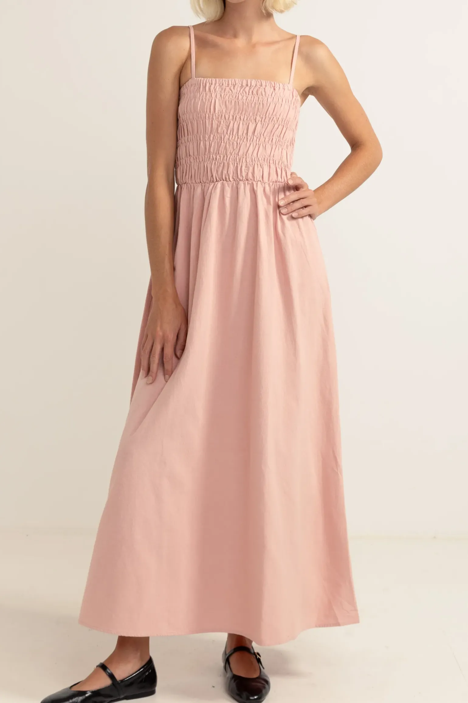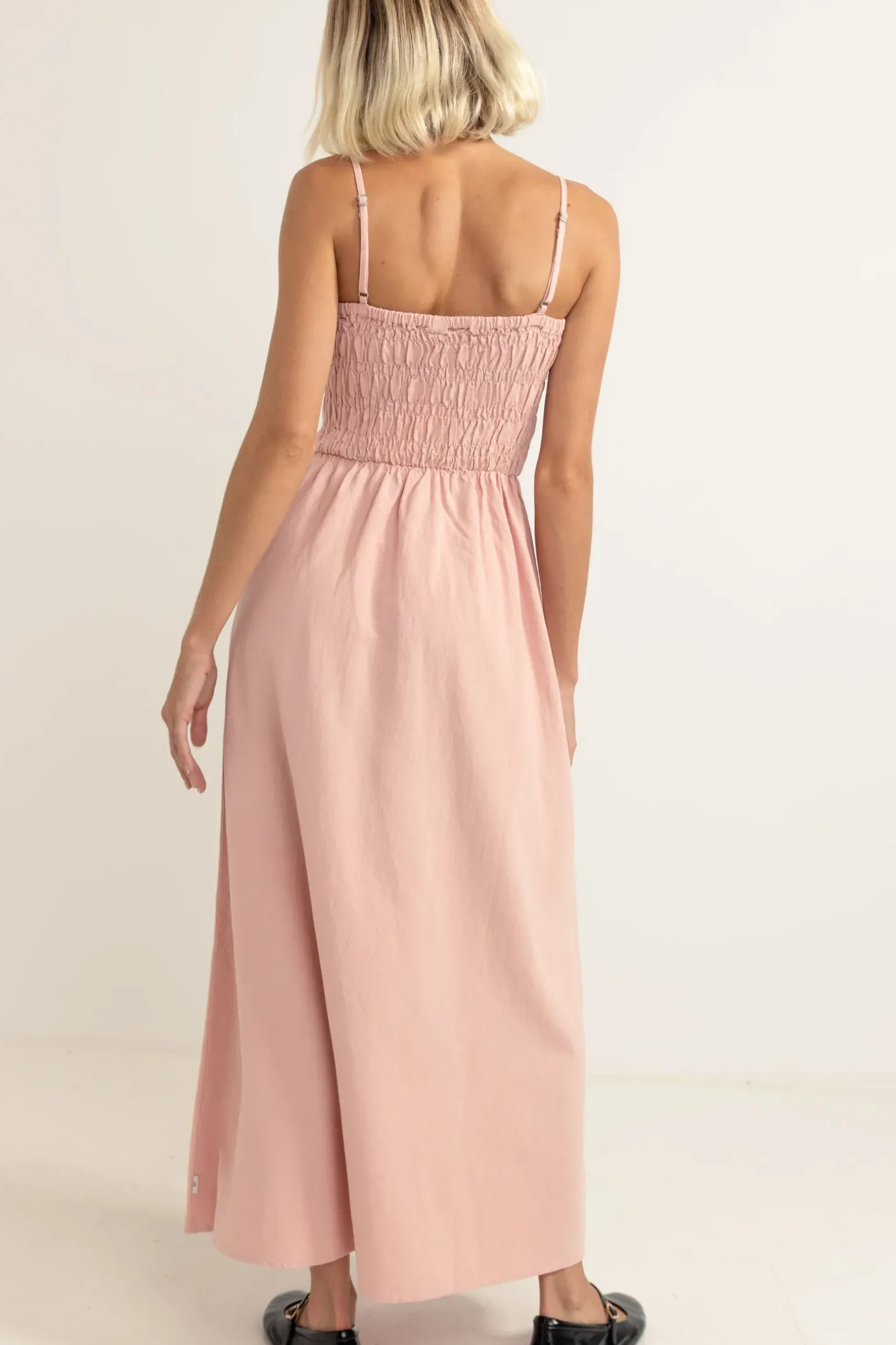 Made for breezy summer days and effortless everyday wearing, the Classic Shirred Midi Dress features a smocked front and back bodice, straight neckline and adjustable straps a season essential.—-Material60% Rayon 40% Linen —- Features Smocked front and back bodice Straight neckline Adjustable straps Midi length —