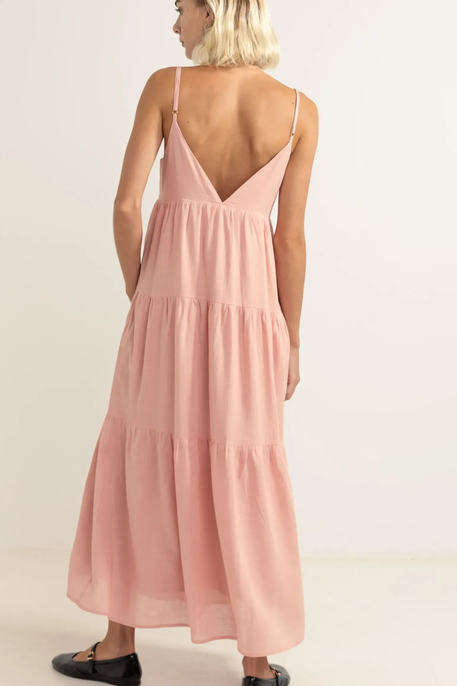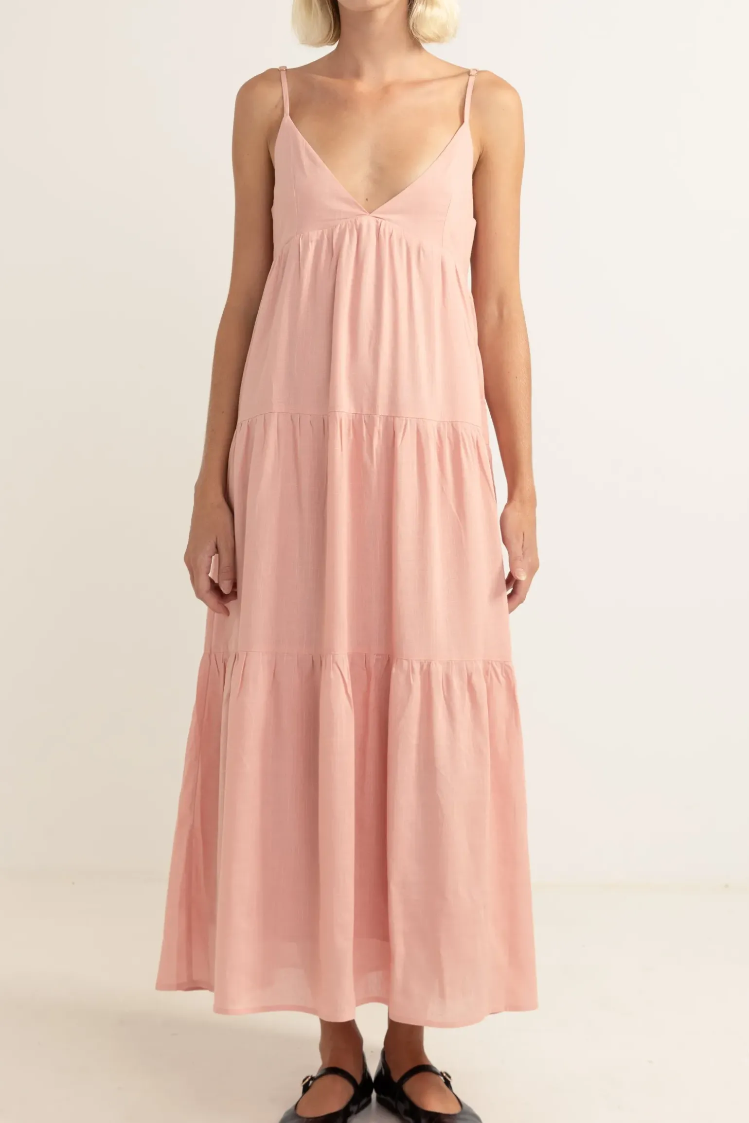 With a fitted bodice, deep V neckline and full sweeping hemline, the Classic Tiered Midi Dress is sure to make a statement. Delivering an elegant coastal design that can be worn between dinner dates, and beach walks both. —- Material 85% Rayon 15% Linen —- Features Relaxed silhouette Adjustable straps —- Size &am