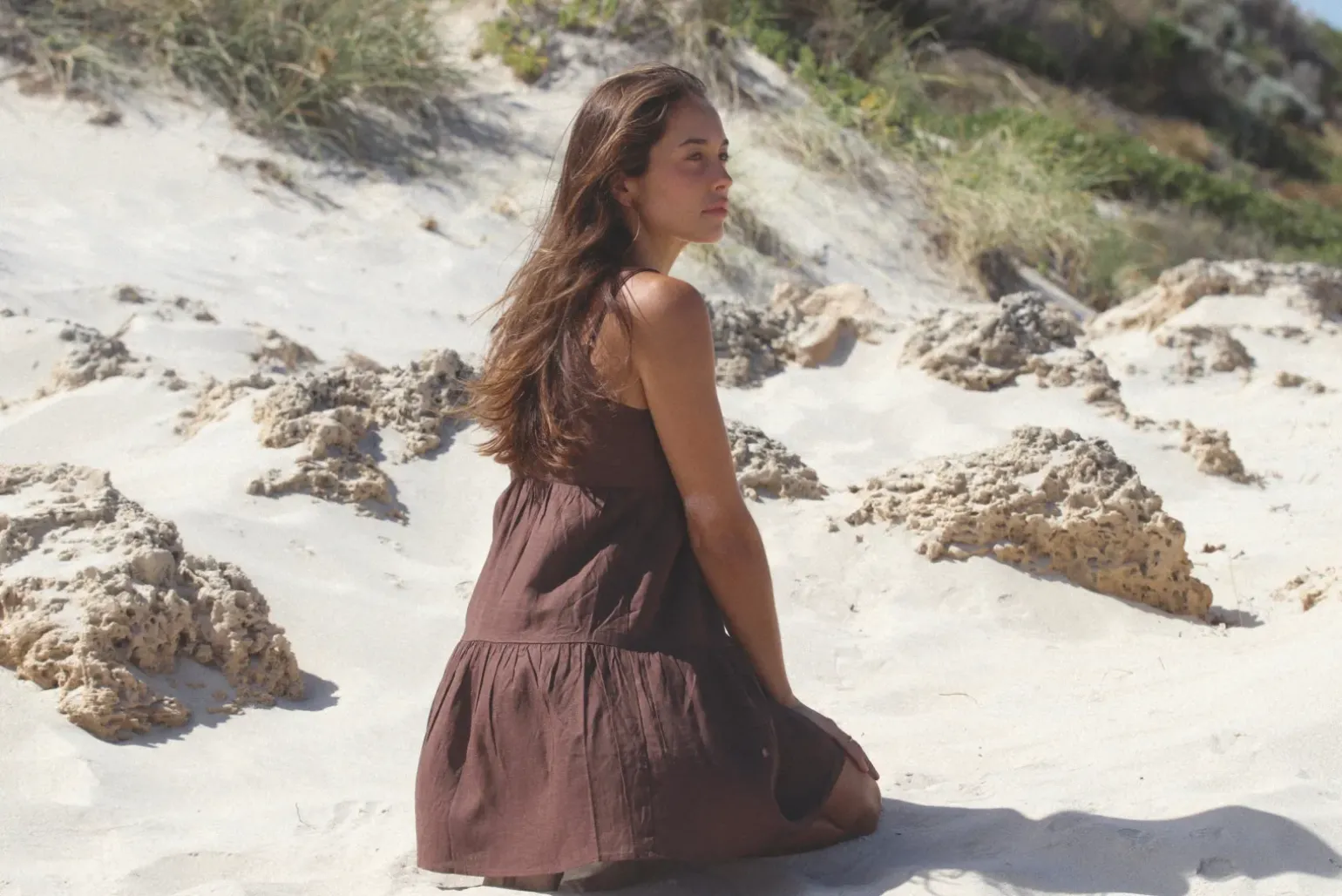 With a fitted bodice, deep V neckline and full sweeping hemline, the Classic Tiered Midi Dress is sure to make a statement. Delivering an elegant coastal design that can be worn between dinner dates, and beach walks both. —- Material 85% RAYON 15% LINEN —- Features Relaxed silhouette Tiered skirt stopping above the