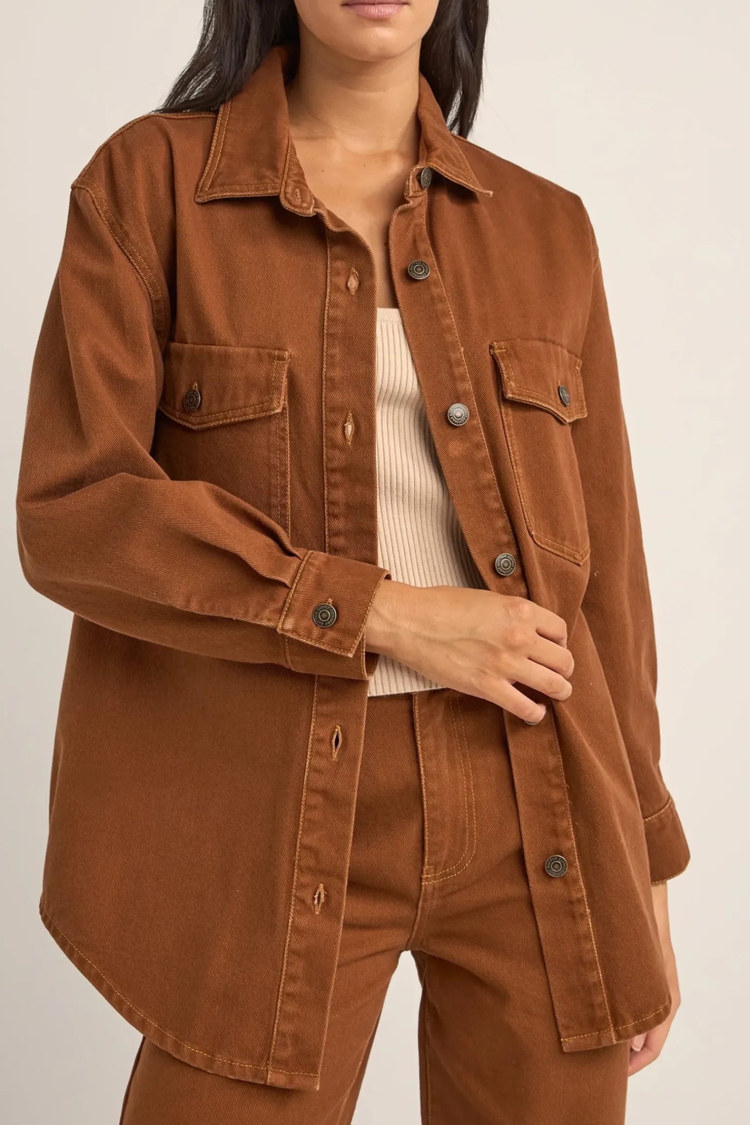 The Cinnamon Claude Drill Shacket brings a warm, earthy tone to your coastal ensemble. This 100% cotton long line shacket is perfect for transitional dressing, combining the practicality of a shirt with the warmth of a jacket. With a curved hem and front chest pockets, it’s inspired by the rugged beauty of seaside cliffs.