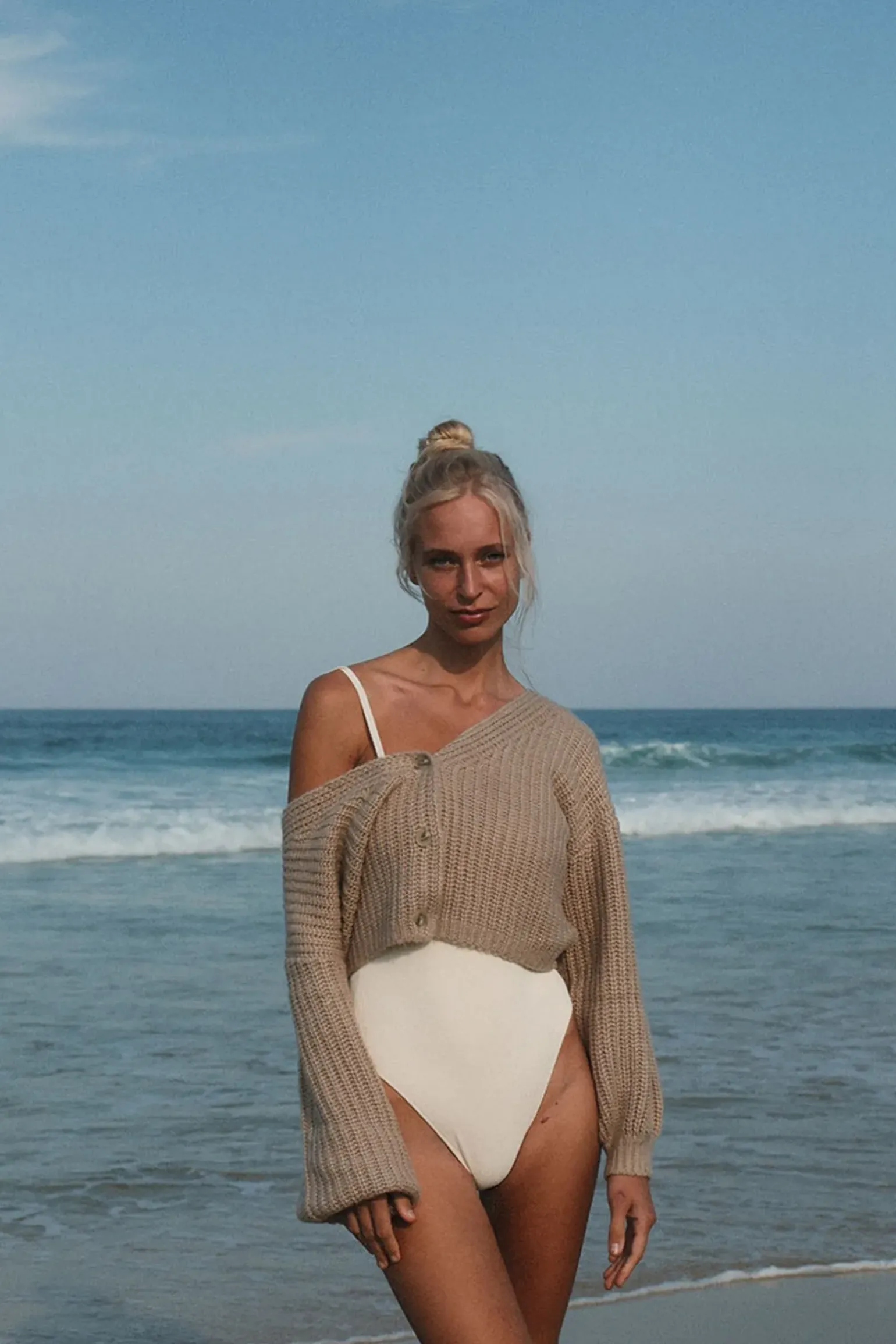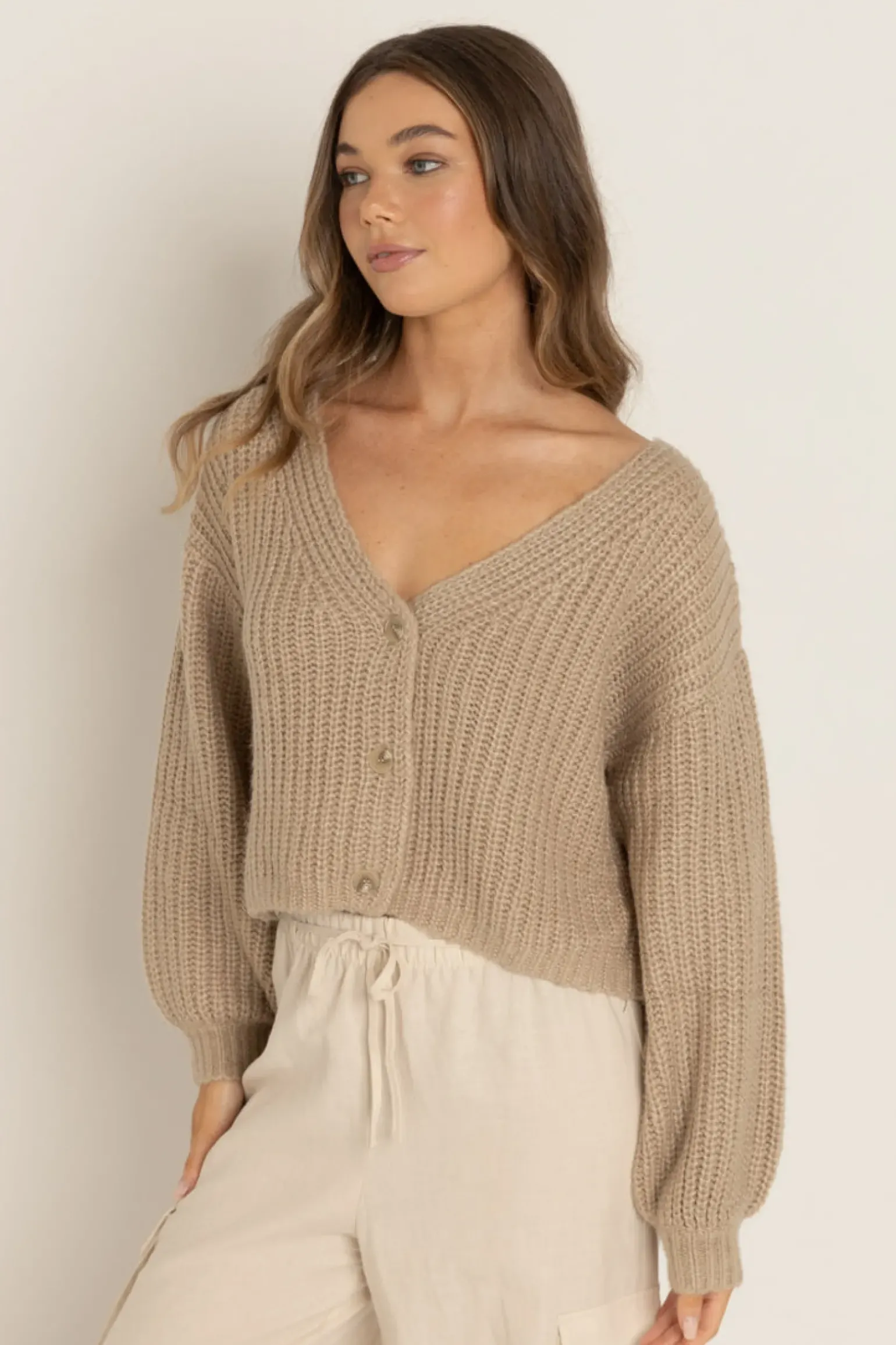 Cozy up in the Eadie Oversized Knit Cardigan. This mid-weight, button-up cardigan offers a relaxed, oversized fit and an artisanal knit texture—perfect for layering on breezy coastal days.