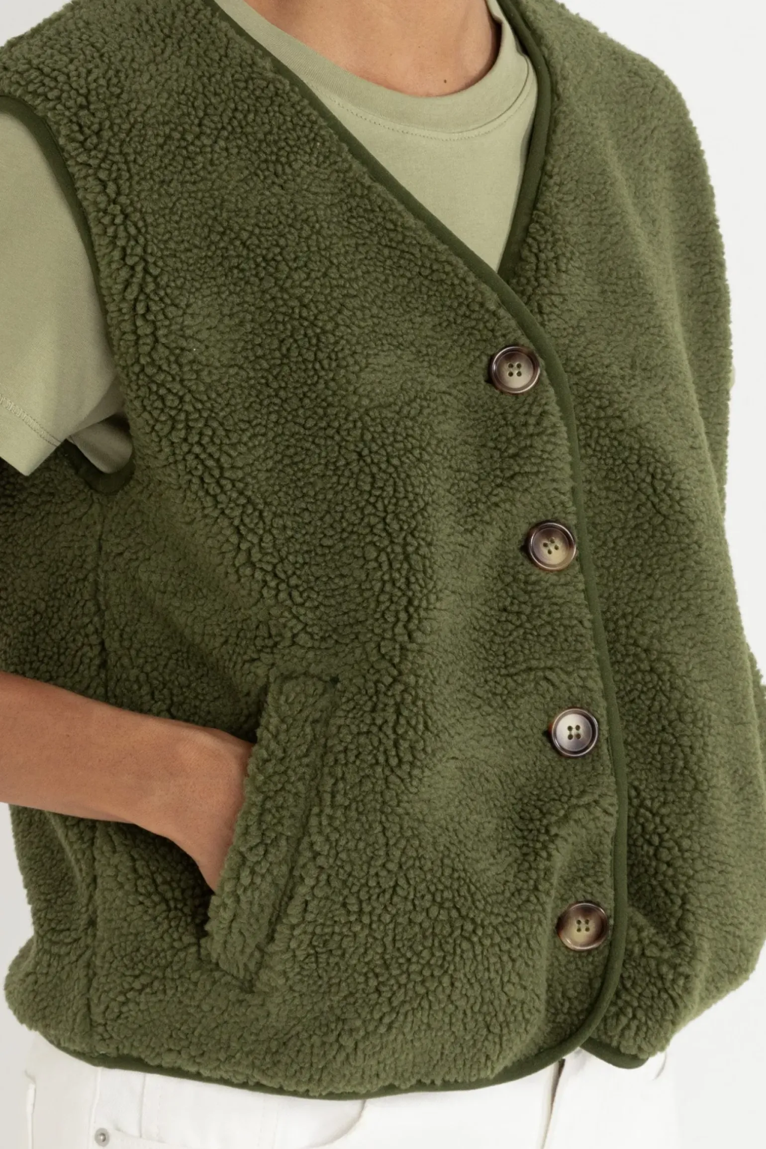 Stay cosy and chic with the Ella Sherpa Vest in Olive. Its relaxed boxy fit, horn button closure, and tactile sherpa fabric make it the perfect layering piece for cool coastal evenings.