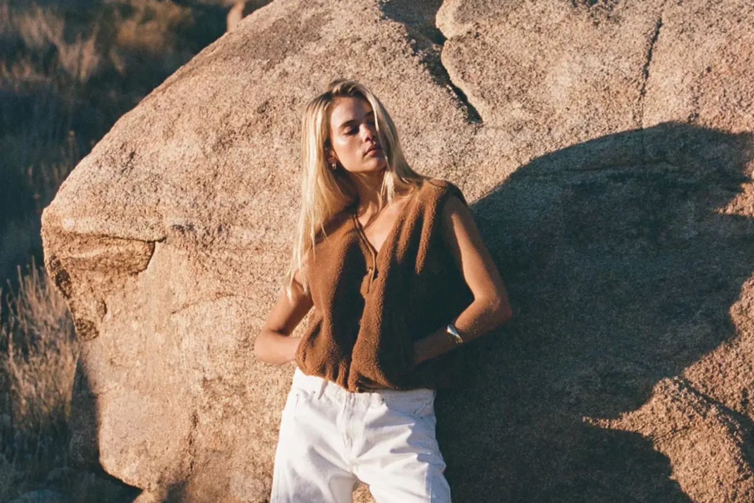 Wrap yourself in the Ella Sherpa Vest in Tobacco, crafted with plush sherpa fabric for ultimate warmth. This boxy-fit design features a horn button closure, combining practical functionality with coastal-inspired style. —- Material 100% Polyester —- Features Boxy fit Horn button closure —- Size & Fit Model we