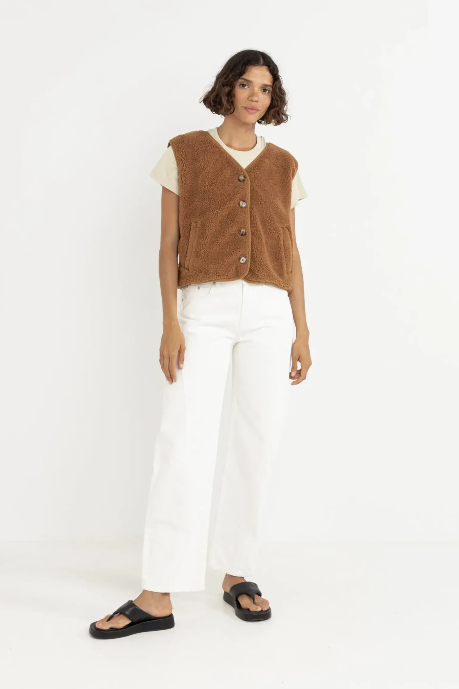 Wrap yourself in the Ella Sherpa Vest in Tobacco, crafted with plush sherpa fabric for ultimate warmth. This boxy-fit design features a horn button closure, combining practical functionality with coastal-inspired style.