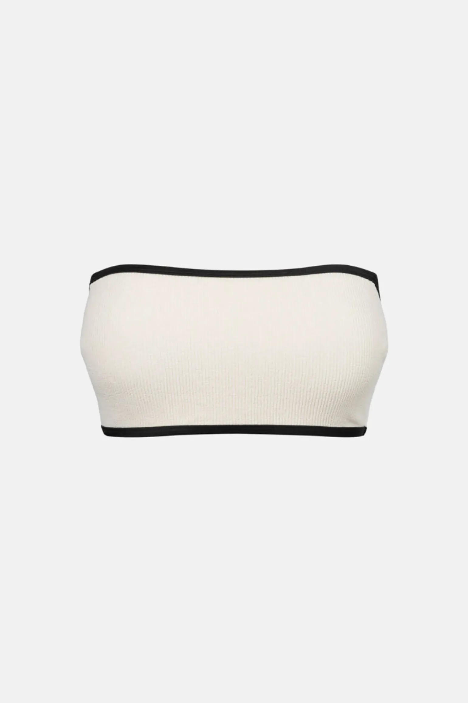 The crème bandeau top features a pull-on style and adjustable straps, offering versatility for A-D cup sizes. White contrast binding and the Rhythm metal coin logo complete the look.