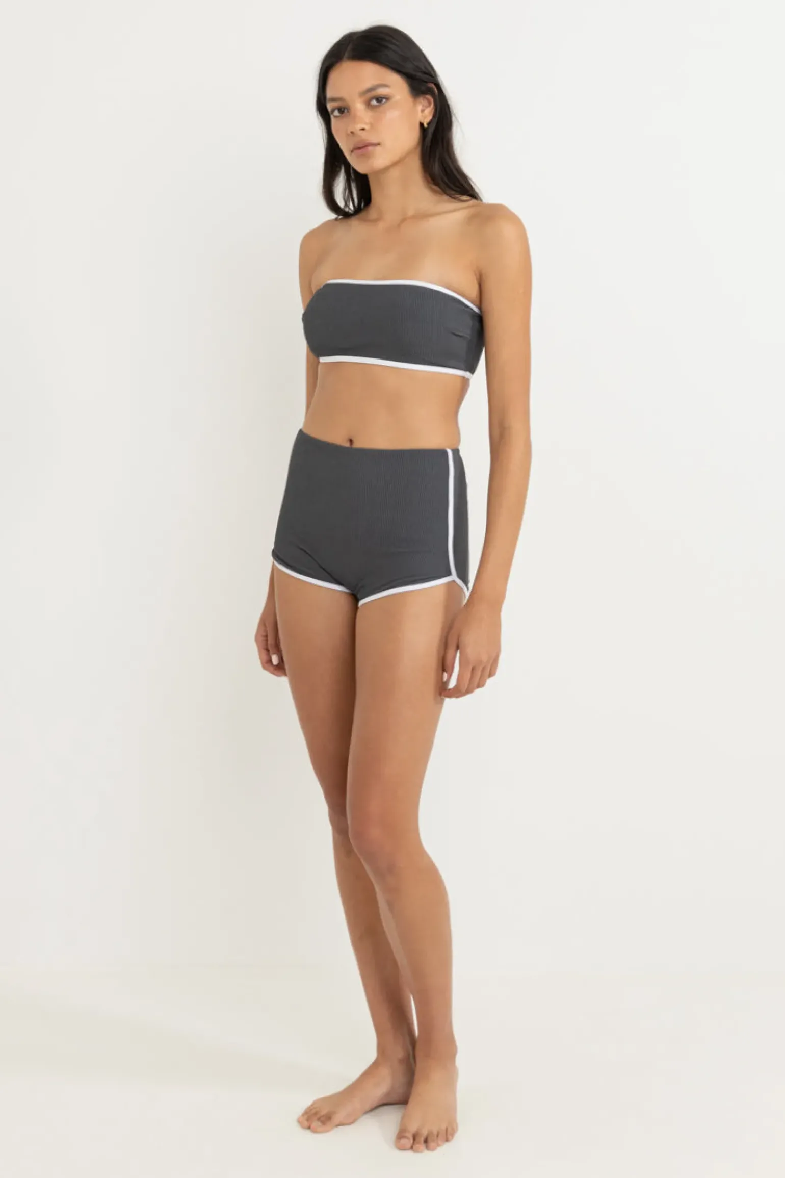 This graphite surf short delivers full coverage with white contrast binding and a high-rise fit. The Rhythm metal coin logo adds a signature detail. —- Material 92% Nylon 8% Spandex —- Features Full coverage High rise fit Double layer lining at front and single at back White contrast binding —- Size & Fit Mod