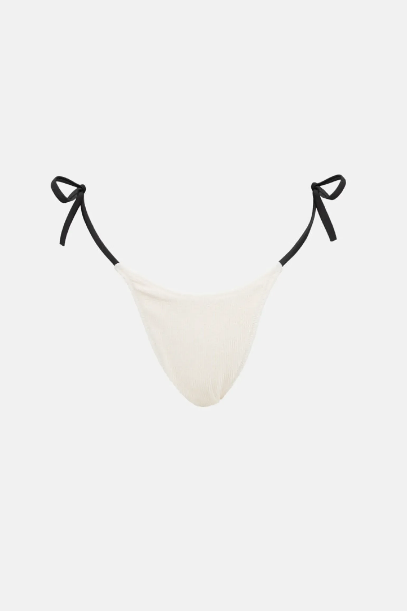 High-rise with a brief cut, this crème pant features adjustable ties and white contrast binding. Finished with the Rhythm metal coin logo for easy coastal style. —- Material 92% Nylon 8% Spandex —- Features Minimal coverage Sits mid-high rise Double lined front, single lined back Contrast binding —- Size & Fi
