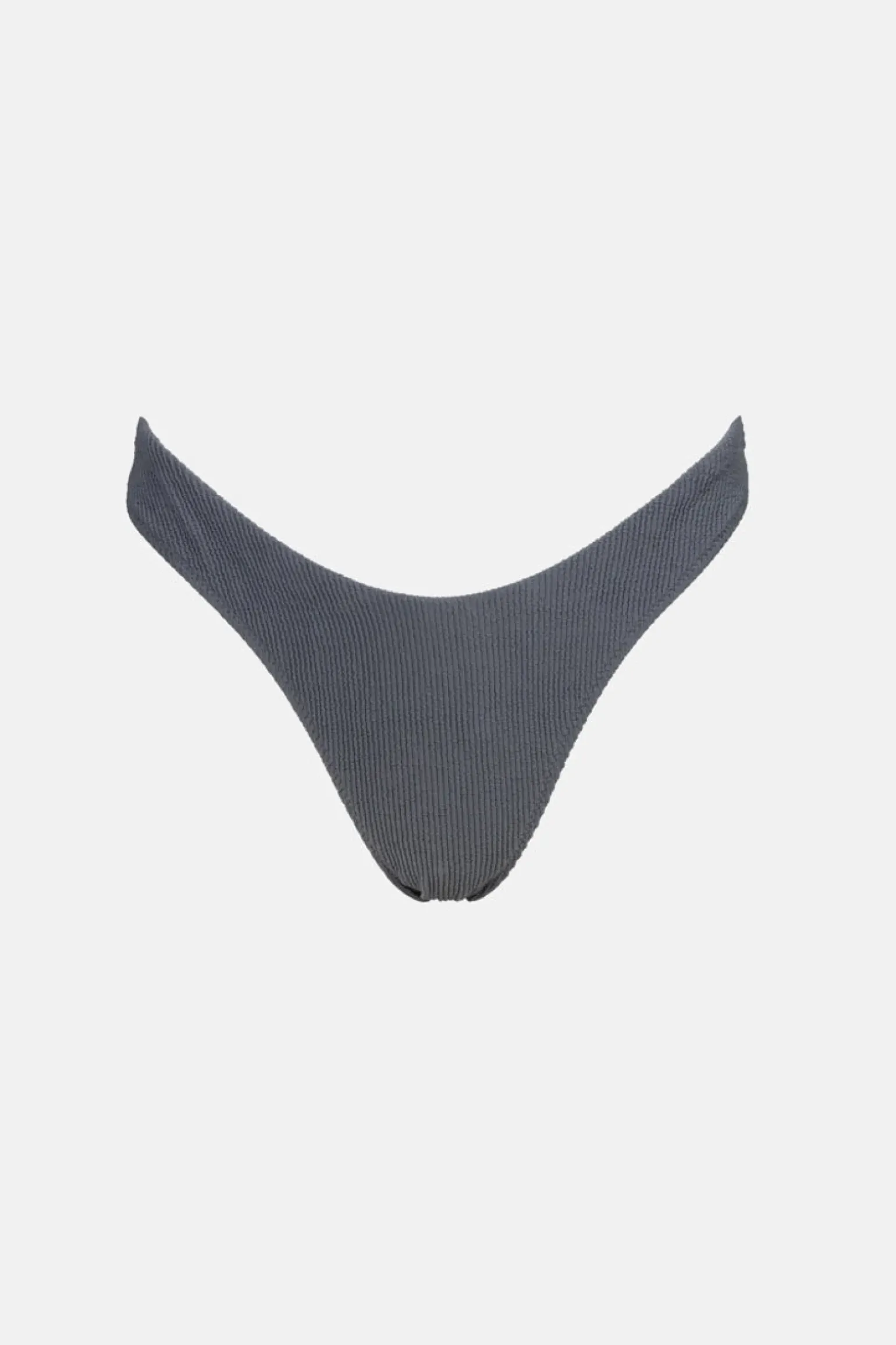 This graphite high-cut pant offers brief coverage with white contrast binding and a high-rise fit. The Rhythm metal coin logo adds a touch of coastal style.