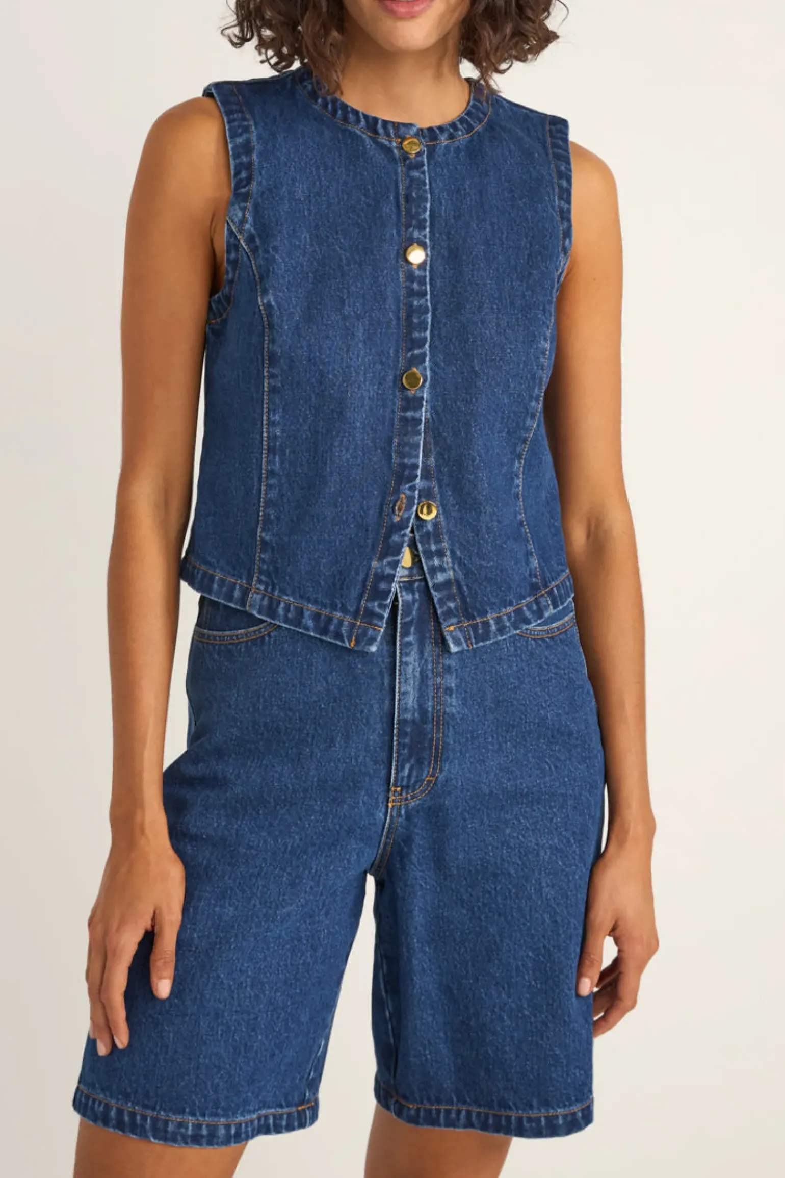 The Gia Denim Vest is a standout with its heavy-weight denim, crew neck, and button-down front. Contrast stitching adds an artisanal touch to this effortlessly cool layer.