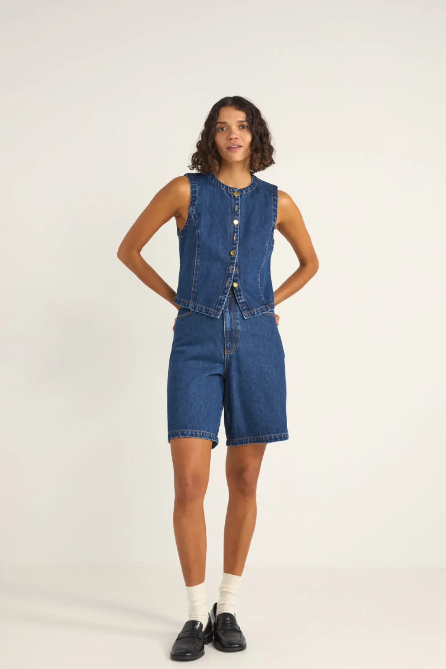 The Gia Denim Vest is a standout with its heavy-weight denim, crew neck, and button-down front. Contrast stitching adds an artisanal touch to this effortlessly cool layer. —- Material 100% Cotton —- Features Button through front Crew neck Contrast stitch —- Size & Fit Model wears a size 8. Her measurements ar