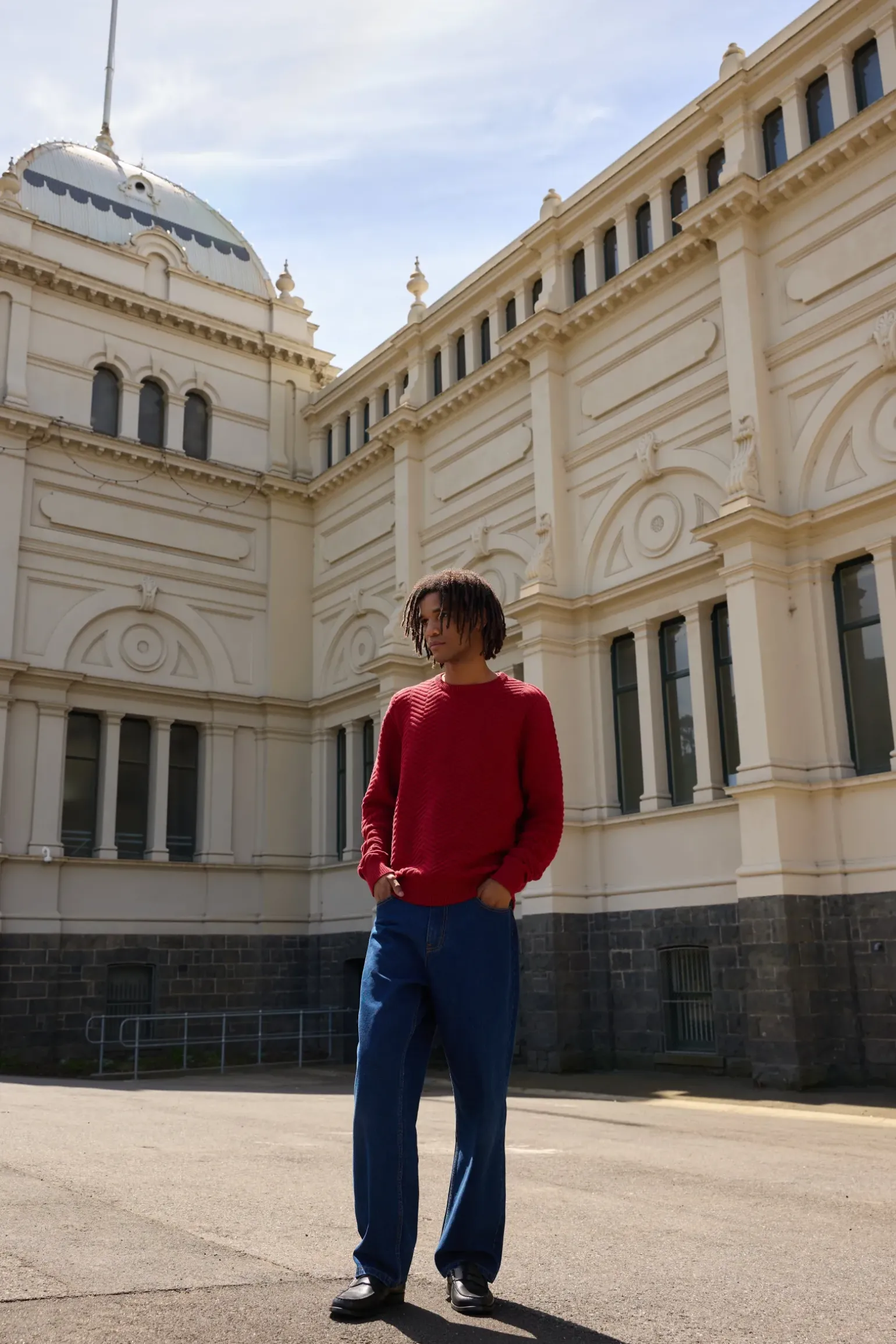 The Herringbone Knit in Red combines intricate texture with timeless appeal. Featuring ribbed cuffs and a hem, this sweater is perfect for adding a pop of color to your cool-weather wardrobe. —- Material 100% Cotton —- Features Ribbed cuff and body hem —- Size & Fit Model wears a size M. His measurements are