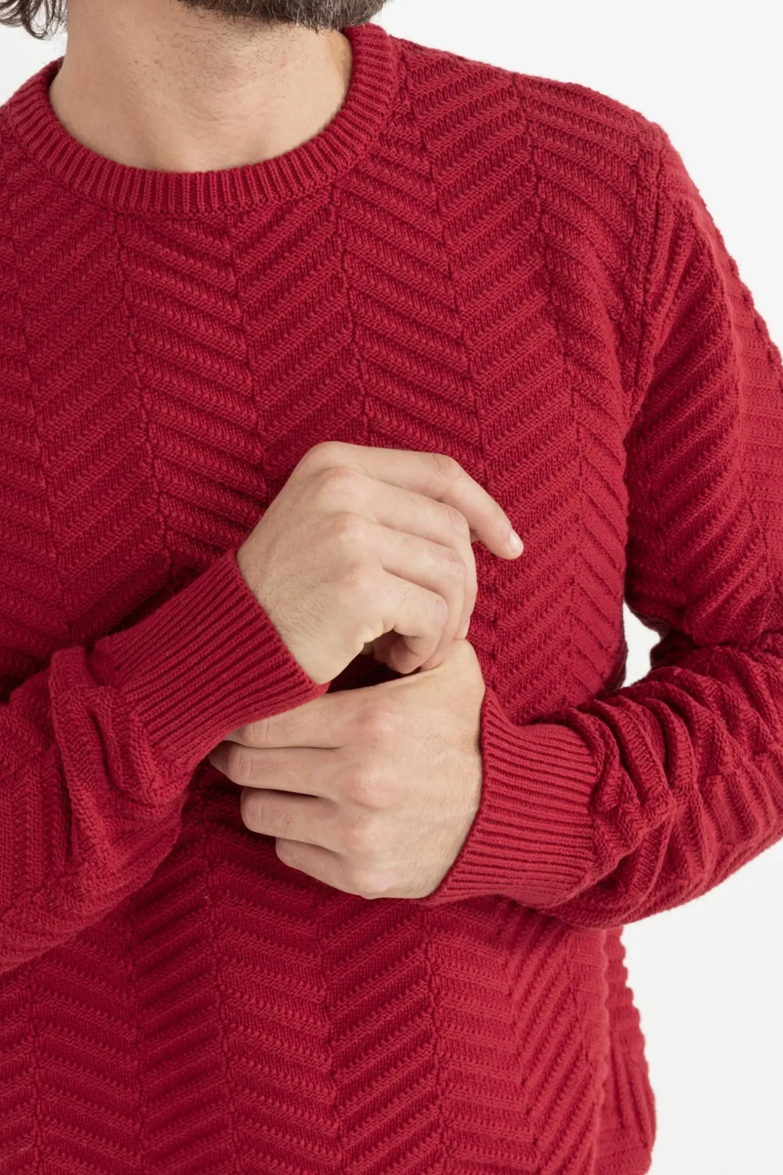 The Herringbone Knit in Red combines intricate texture with timeless appeal. Featuring ribbed cuffs and a hem, this sweater is perfect for adding a pop of color to your cool-weather wardrobe.