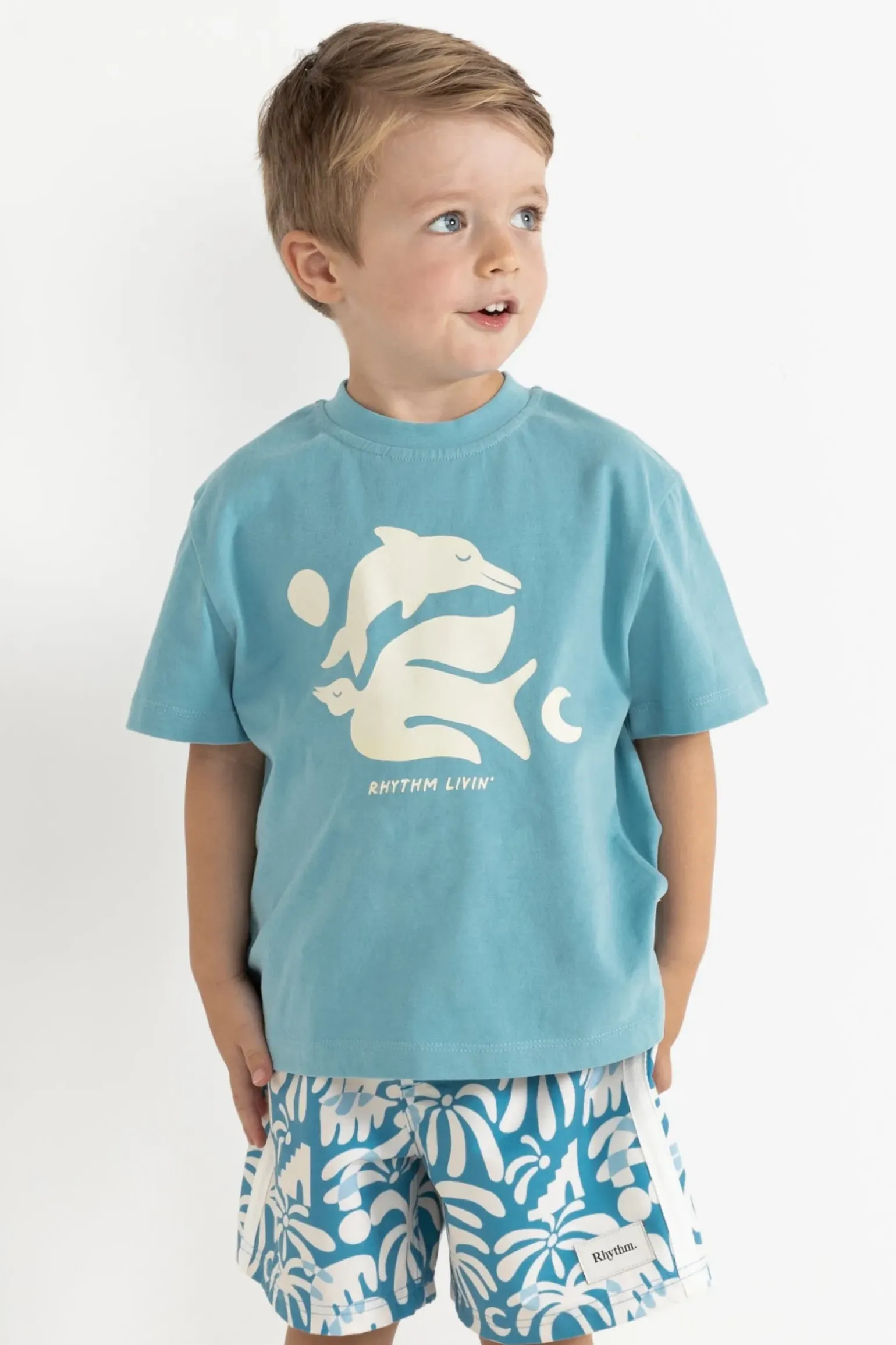This relaxed-fit tee in a bold blue shade offers soft cotton jersey comfort with a touch of whimsy through its playful graphic print. Perfect for adventurous little ones who love to stand out. —- Material 100% Cotton —- Features Screen print design on back Rhythm trims —- Size & Fit Model wears a size 4 Heigh
