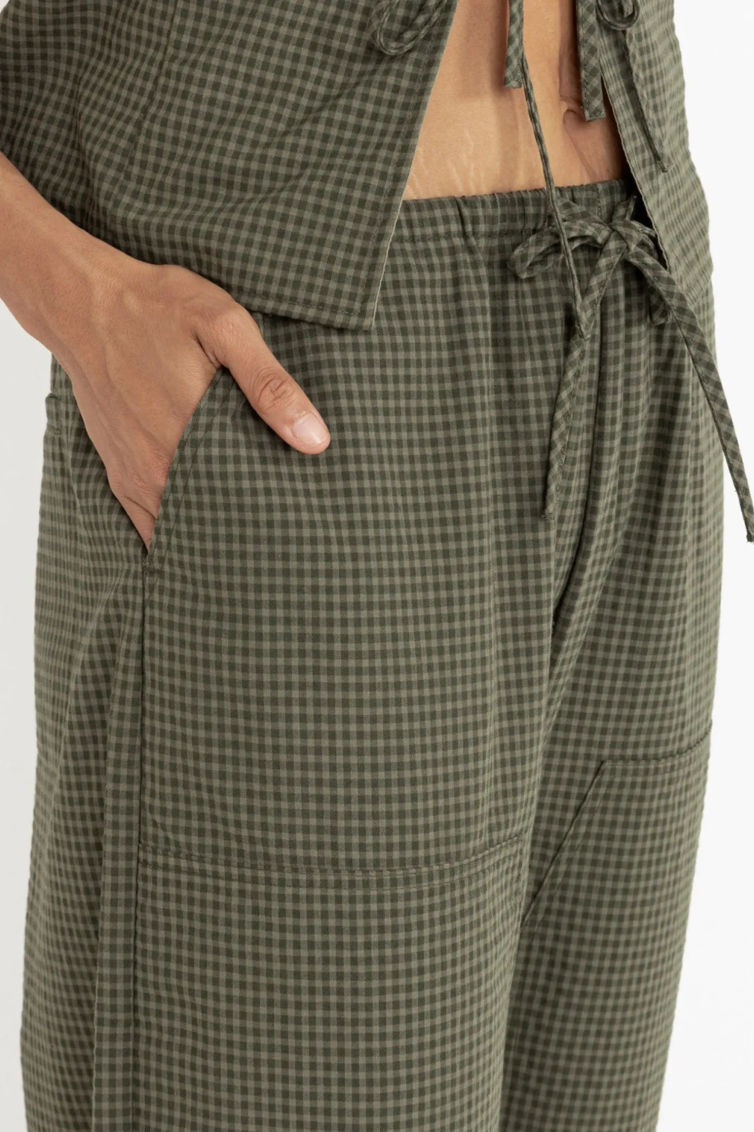 The Louise Check Drawstring Pant in Olive merges relaxed comfort with tailored details. A mid-rise fit, straight-leg silhouette, and front patch pockets make it a must-have for casual wear.