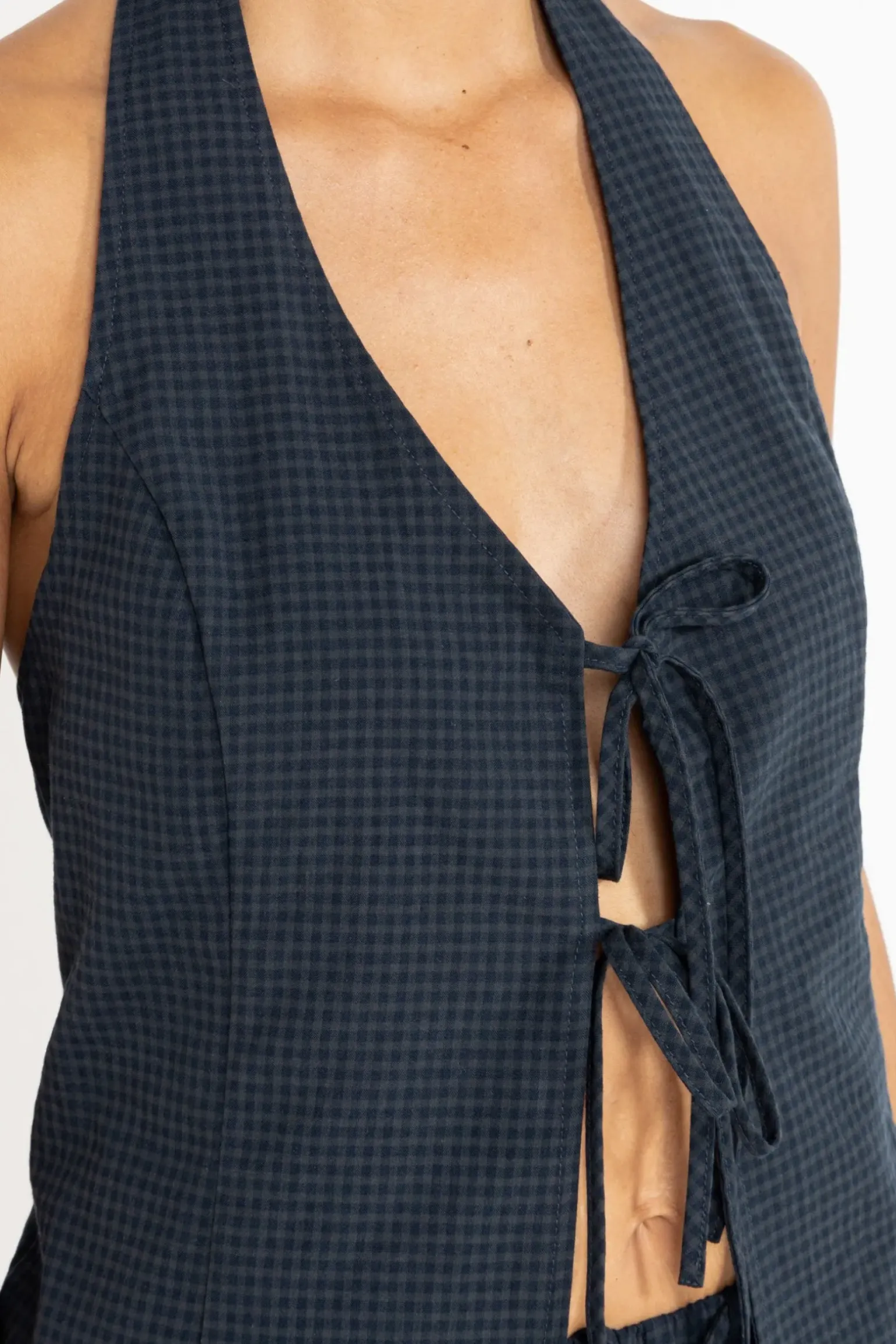 Add a nautical touch to your wardrobe with the Louise Check Halter Top in Navy. Featuring front ties and a smocked back, this piece is perfect for warm days by the water.