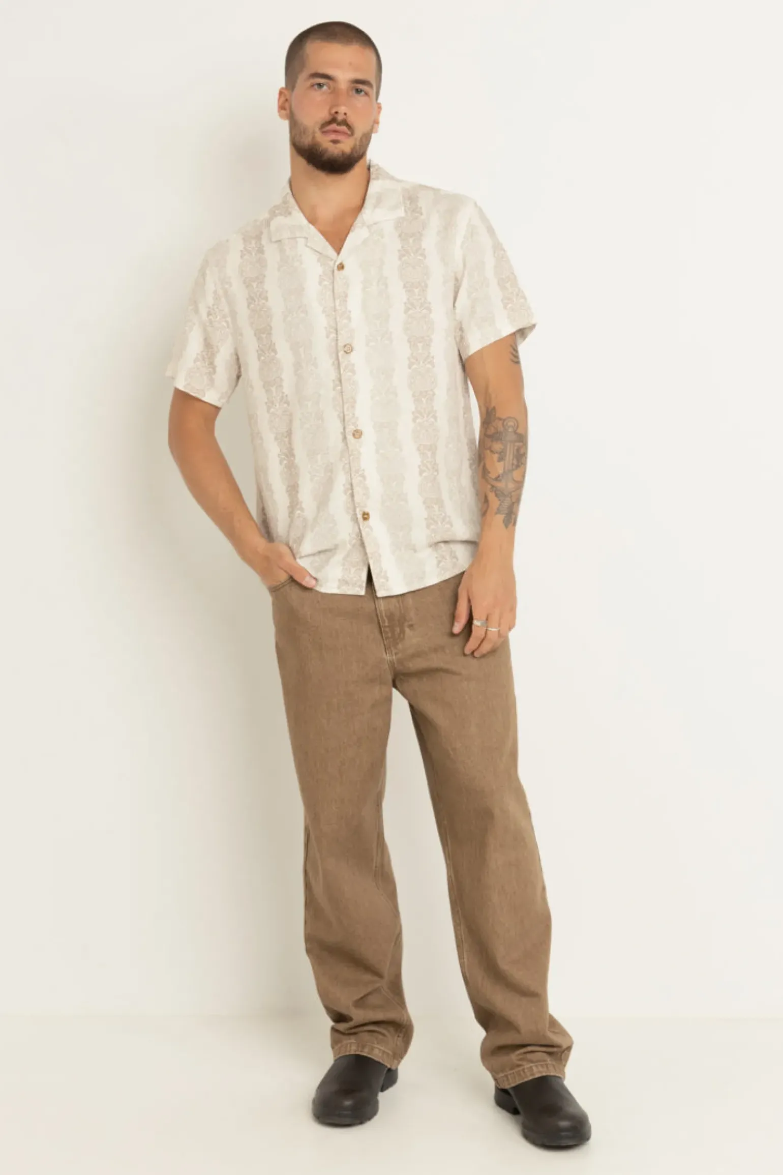 Explore floral sophistication in the Pineapple Stripe Ss Shirt Sand, crafted from 100% Rayon with a seasonal yardage print. Its Cuban collar and washed vintage feel make it a versatile choice for evening gatherings or daytime escapades.