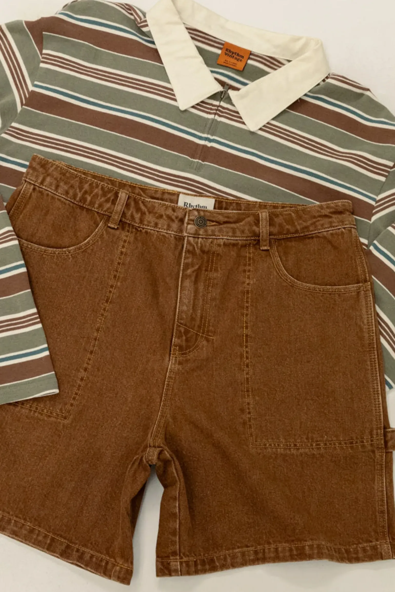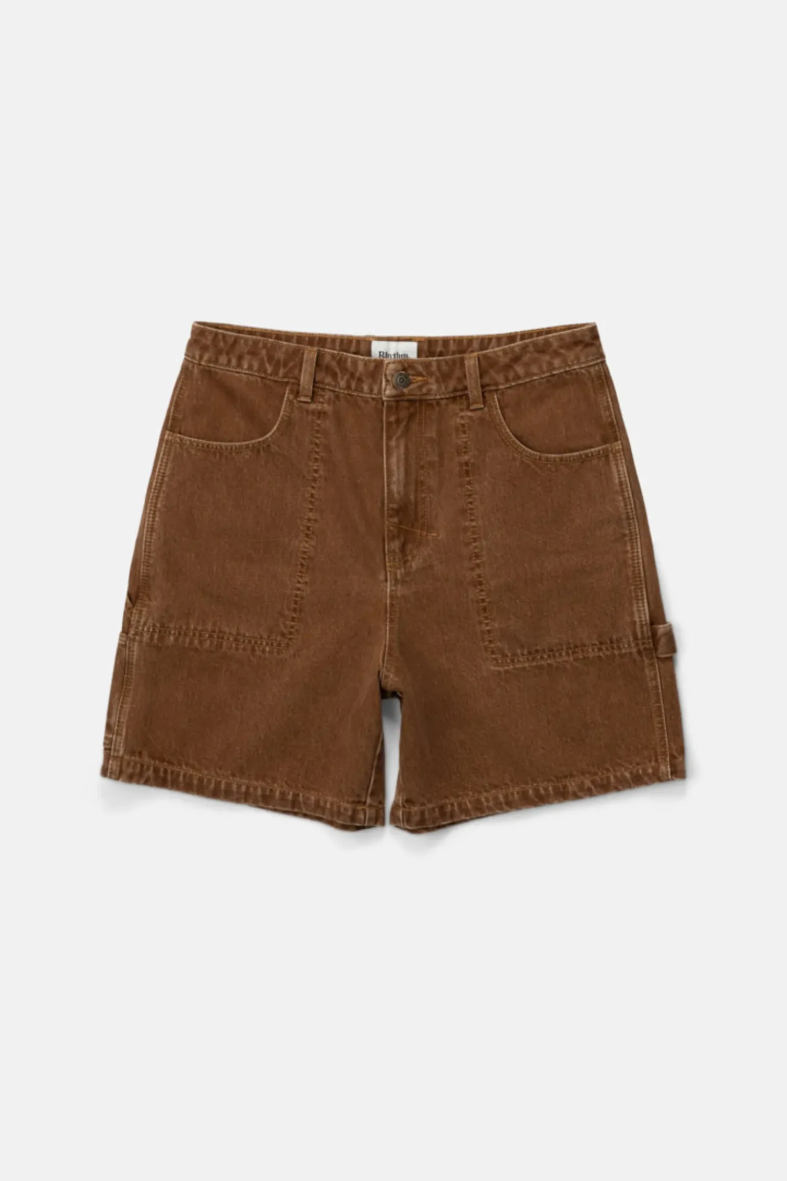 Vintage-inspired denim shorts with an open leg, extra pockets, and contrast stitching. Worn-washed for an authentic, aged feel.