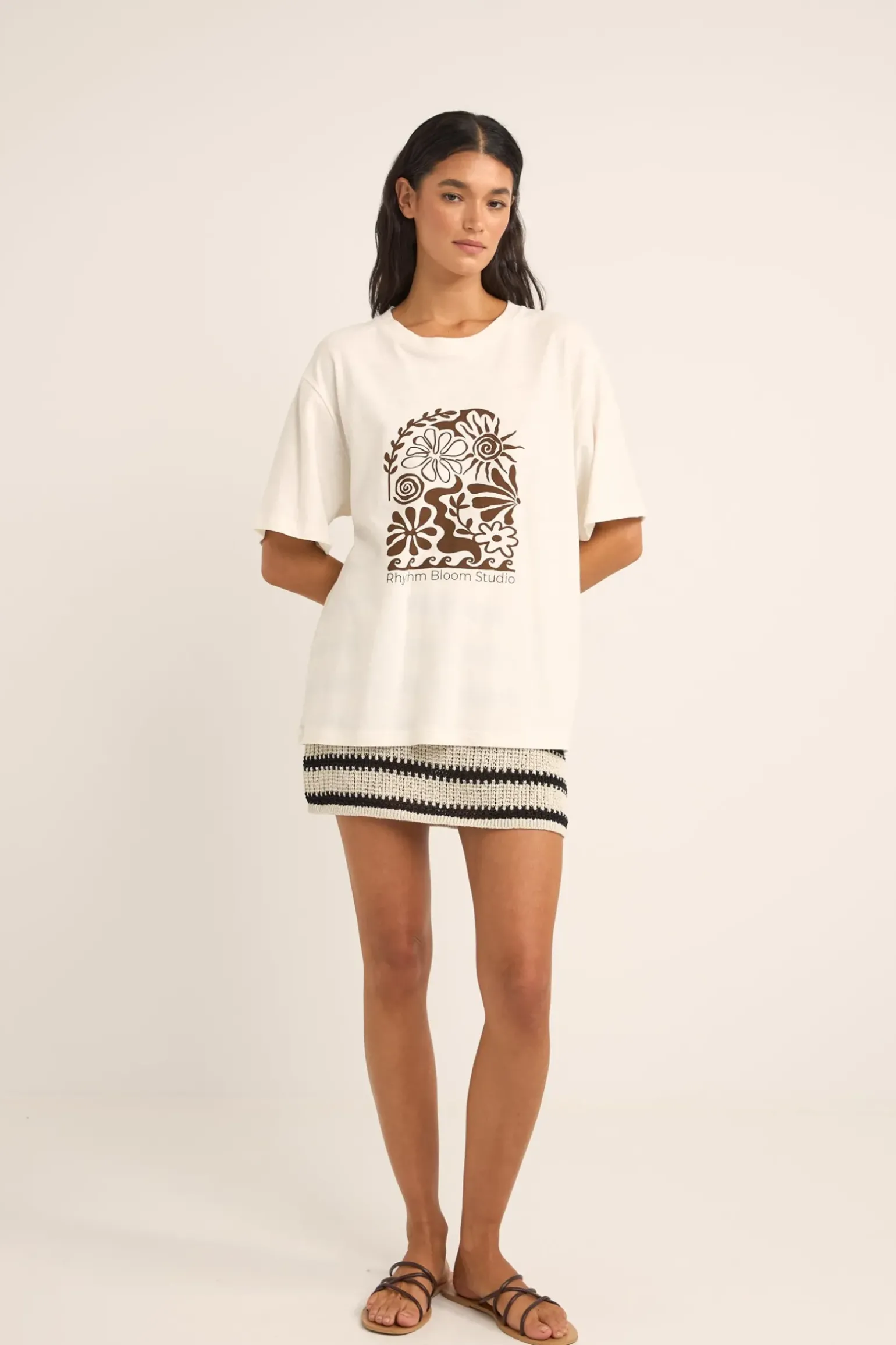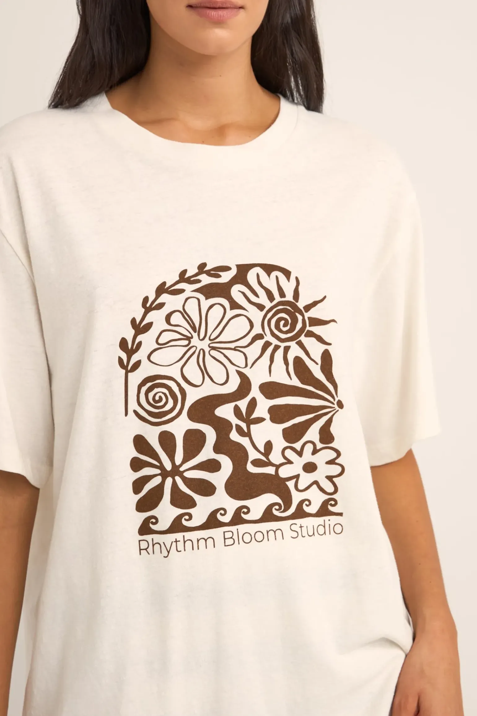 The Vintage White Bloom Studio Oversized T-Shirt is a canvas for nature’s artistry, blending 55% linen with 45% cotton for a breathable, lightweight feel. This oversized tee, adorned with a water-based ink print, features a relaxed silhouette with round crew neck and elbow-length short sleeves to breathe new life into your wardrobe