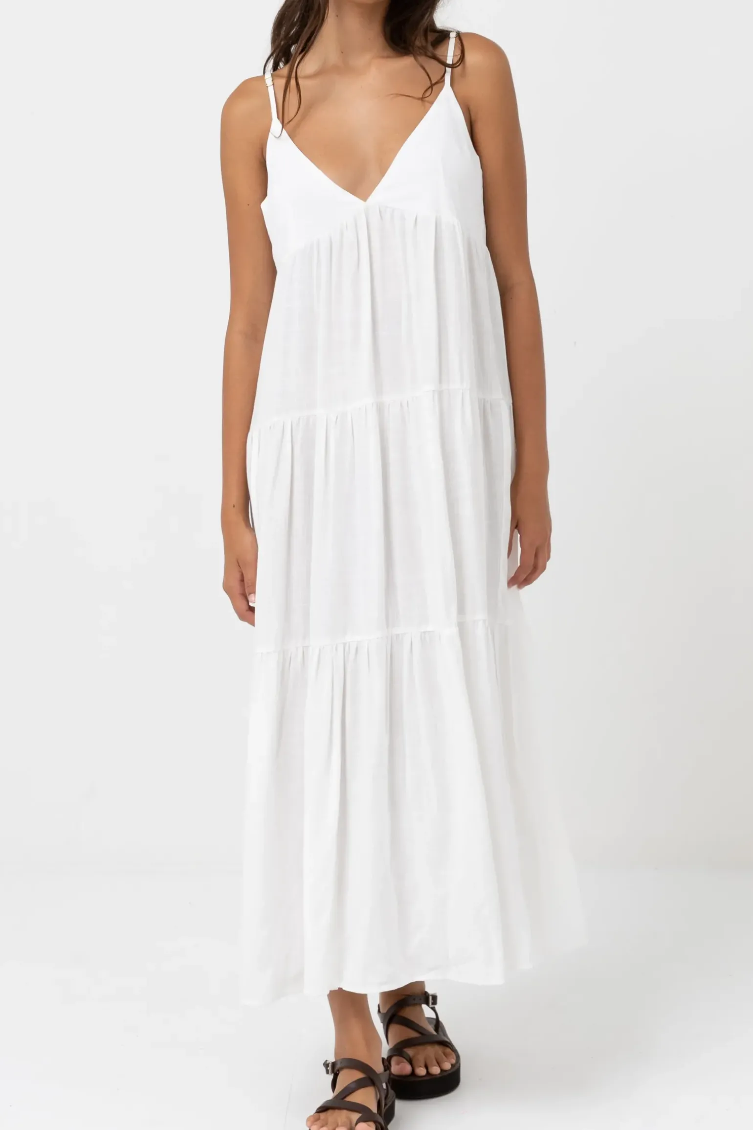 With a fitted bodice, deep V neckline and full sweeping hemline, the Classic Tiered Midi Dress is sure to make a statement. Delivering an elegant coastal design that can be worn between dinner dates, and beach walks both. —- Material 85% RAYON 15% LINEN —- Features Relaxed silhouette Tiered skirt stopping above the