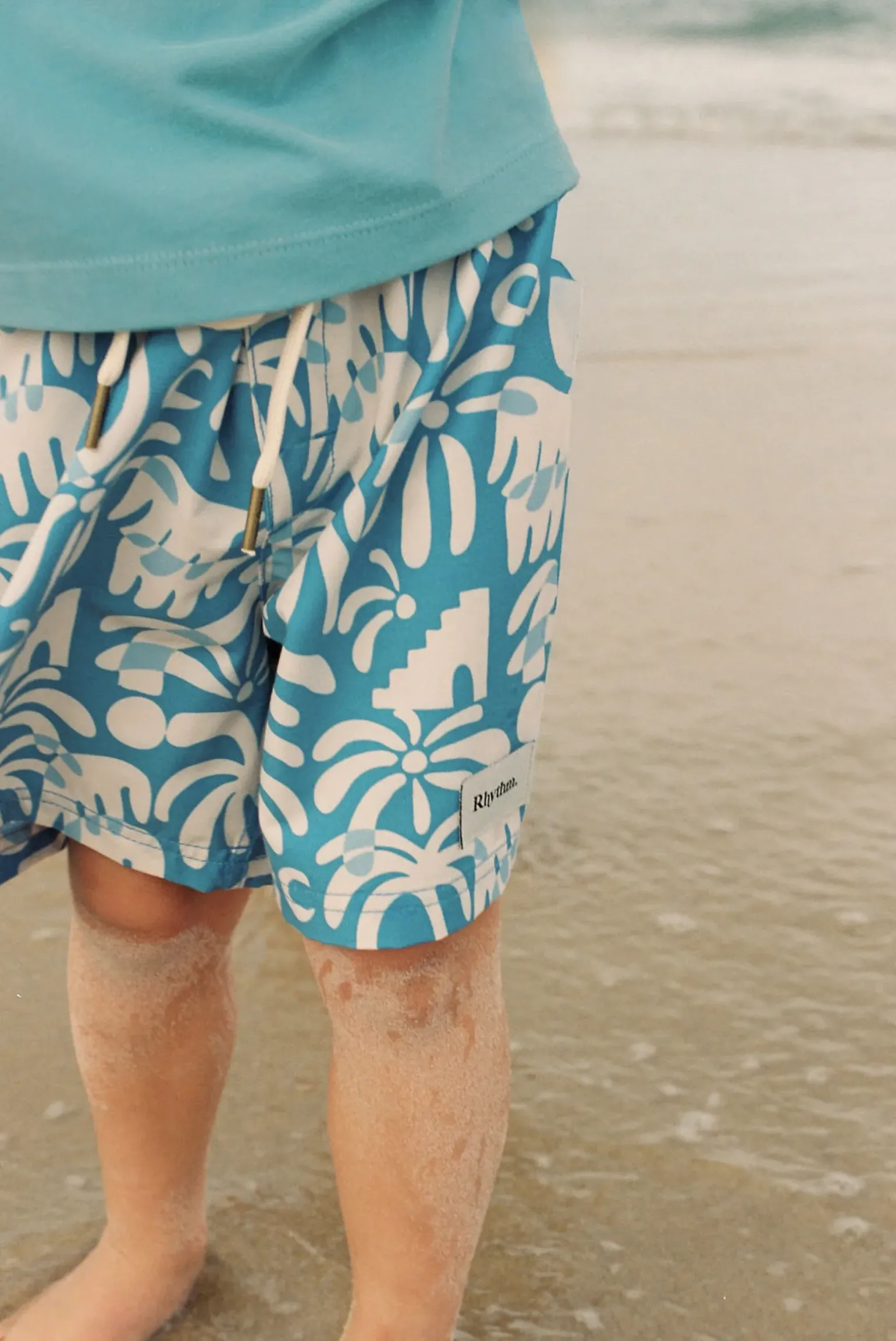 Relaxed-fit elastic-waist shorts in a serene blue hue, crafted for easy movement and carefree play. Perfect for seaside days or backyard adventures. —- Material 35% Recycled Polyester 38% Polyester 21% Cotton 6% Spandex —- Features Elastic waist Drawstring Rhythm trims —- Size & Fit Model wears a size 4 Heigh