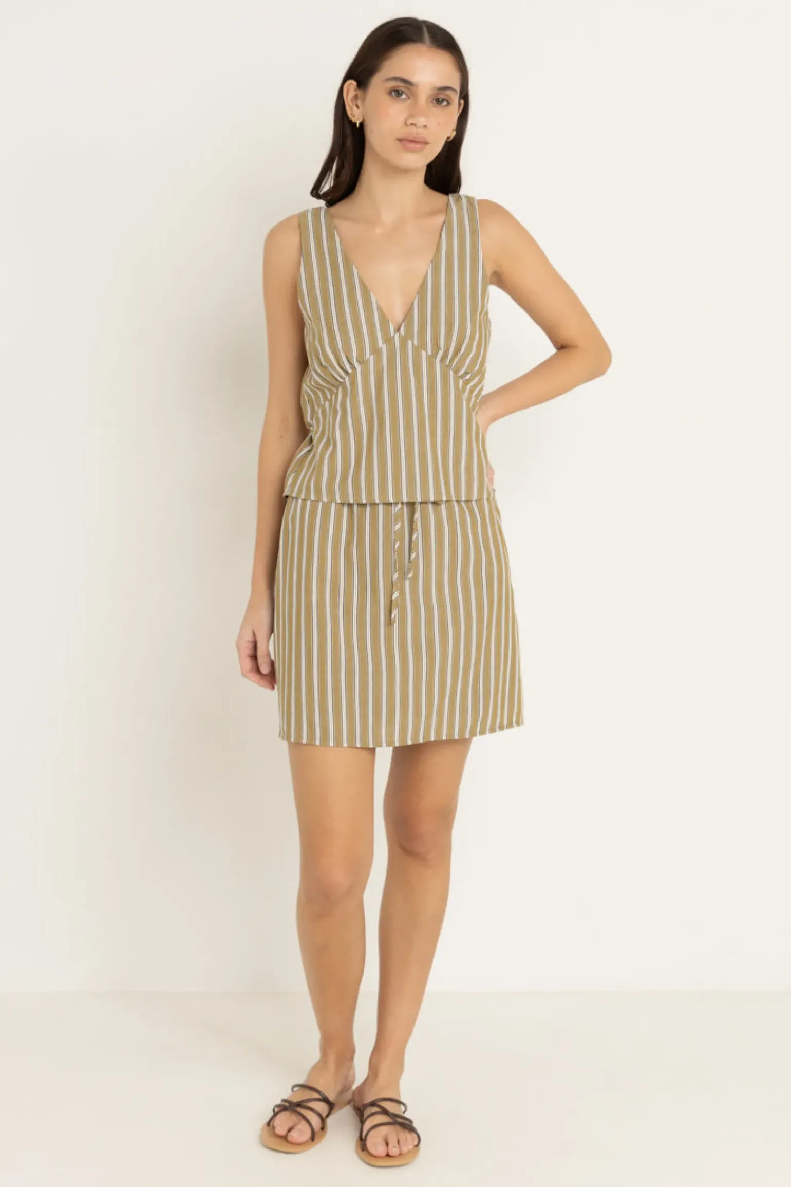 The Lenny Drawcord Skirt in Olive offers a lightweight, striped design with a functional drawcord waist. This versatile mini skirt is ideal for sun-soaked, casual days by the coast.