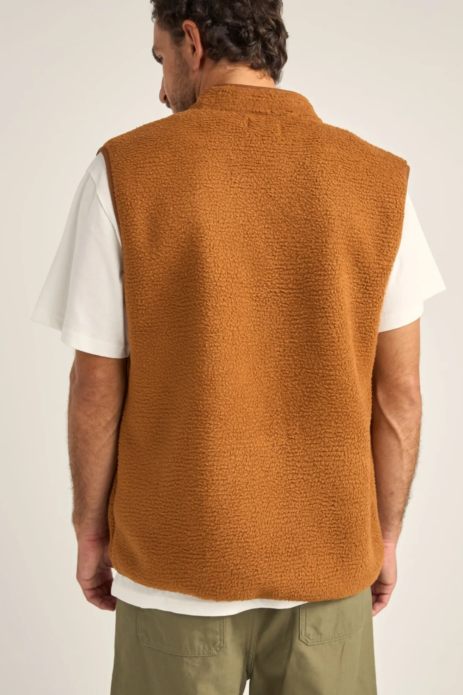 Introducing the Marco Sherpa Vest in Tobacco, a boxy vest designed for coastal style. Featuring a cozy sherpa texture, contrast trim, and zipper closure, it's perfect for layering and adding warmth to your look with a touch of rugged charm. —- Material 100% Polyester —- Features Boxy fit Contrast trim Contrast zipp