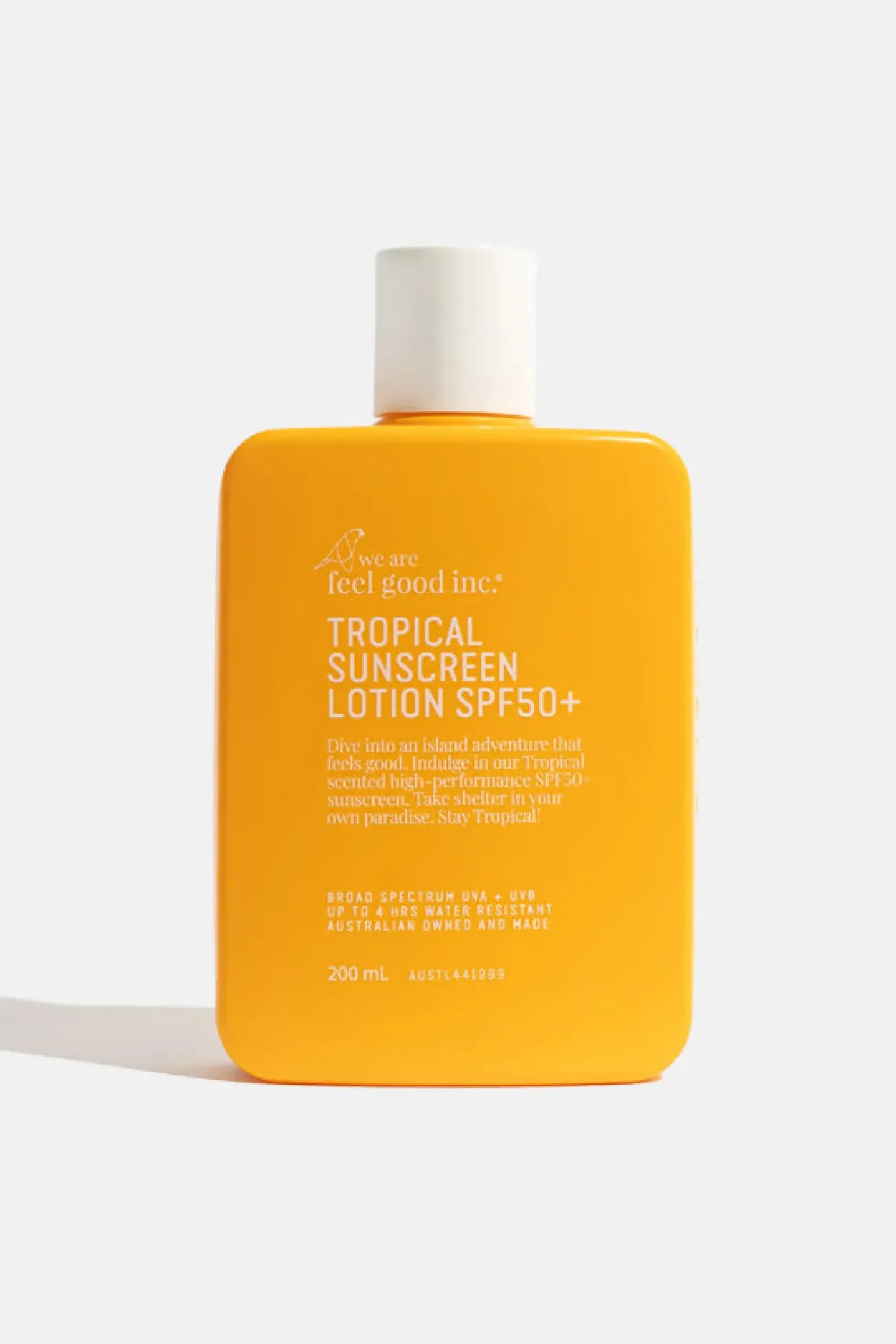 We Are Feel Good Inc. Tropical Sunscreen Lotion SPF50+ is made for those who live life under the sun, ensuring you can enjoy your daily sunscreen routine with a touch of the tropics. This new formula brings you all the benefits of their Signature Sunscreen, now enhanced with tropical fruit extracts like mango, pineappl